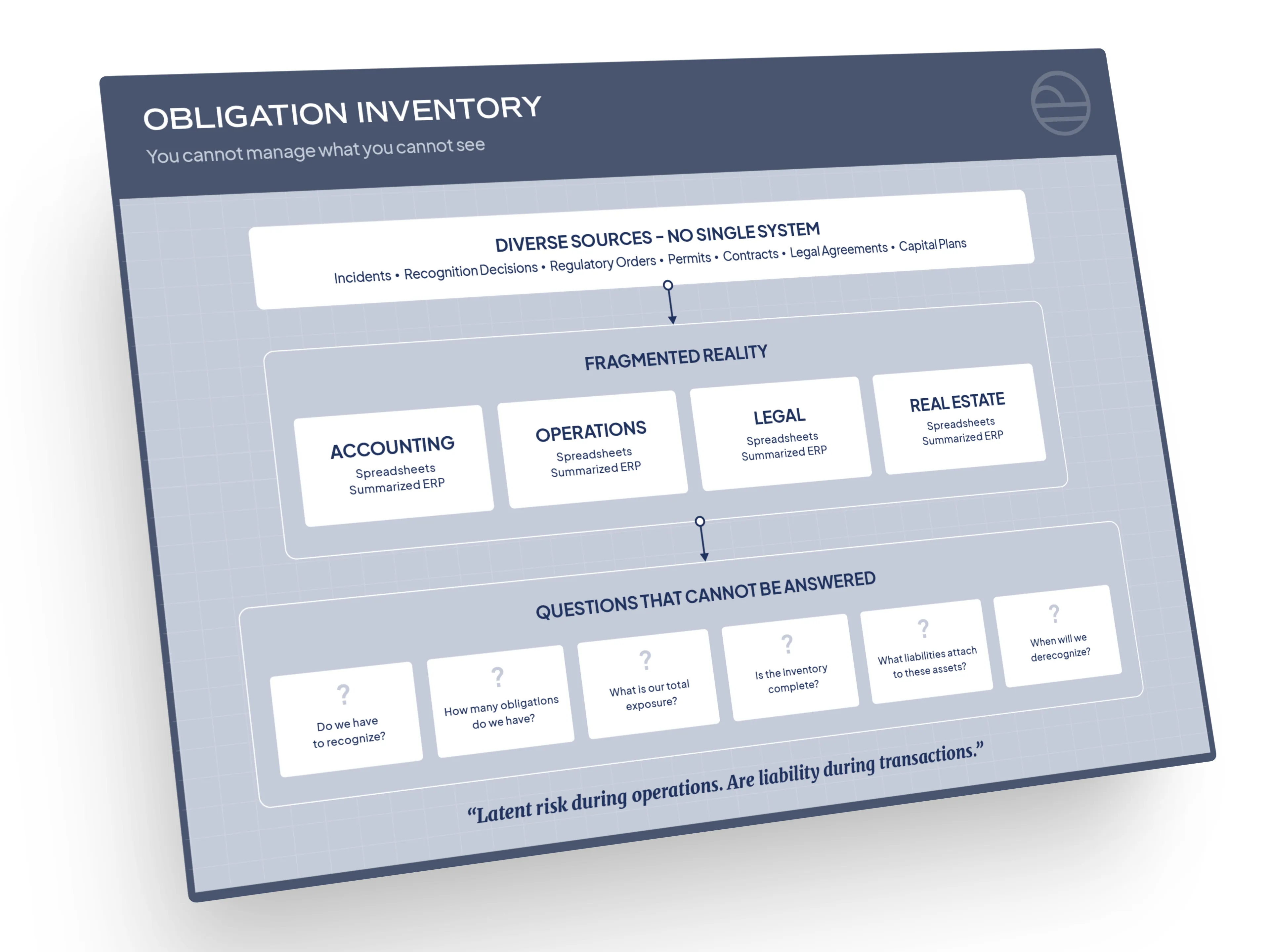 Completeness cannot be verified. Legacy Obligations fade as institutional knowledge turns over. New Obligations emerge as site conditions change or regulations evolve without being consistently captured. Watch-list Obligations that may require future recognition are inconsistently tracked or lost entirely. Organizations cannot assert with confidence that their inventory reflects the full population of Obligations, and neither can their auditors.
