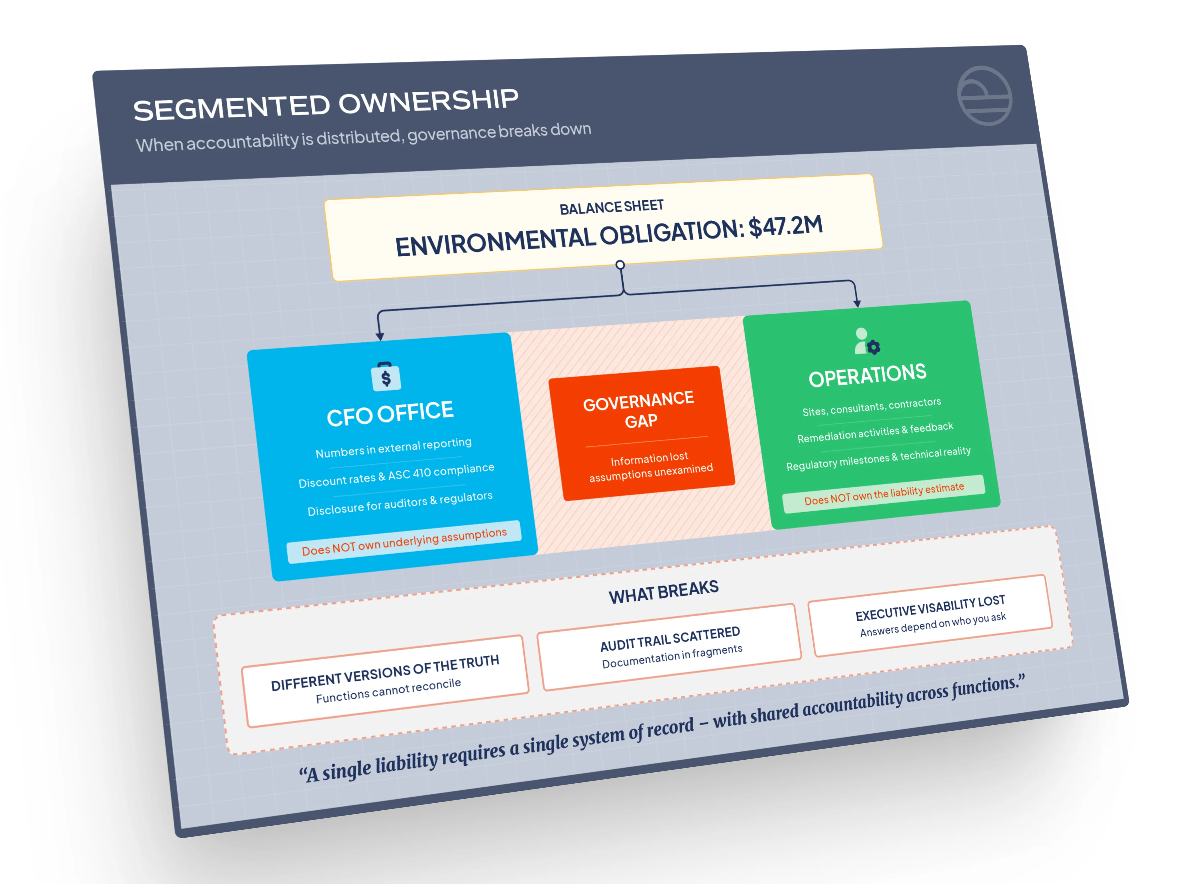 Loss of Executive and Board Visibility: Executives and boards cannot exercise effective oversight when answers to basic questions depend on which function is asked. Environmental Obligation exposure, reserve adequacy, and obligation status vary by source. Strategic decisions, including transactions and portfolio actions, proceed on incomplete or conflicting information. The board sees reported numbers without visibility into the governance gaps underneath. That is not oversight. It is exposure.